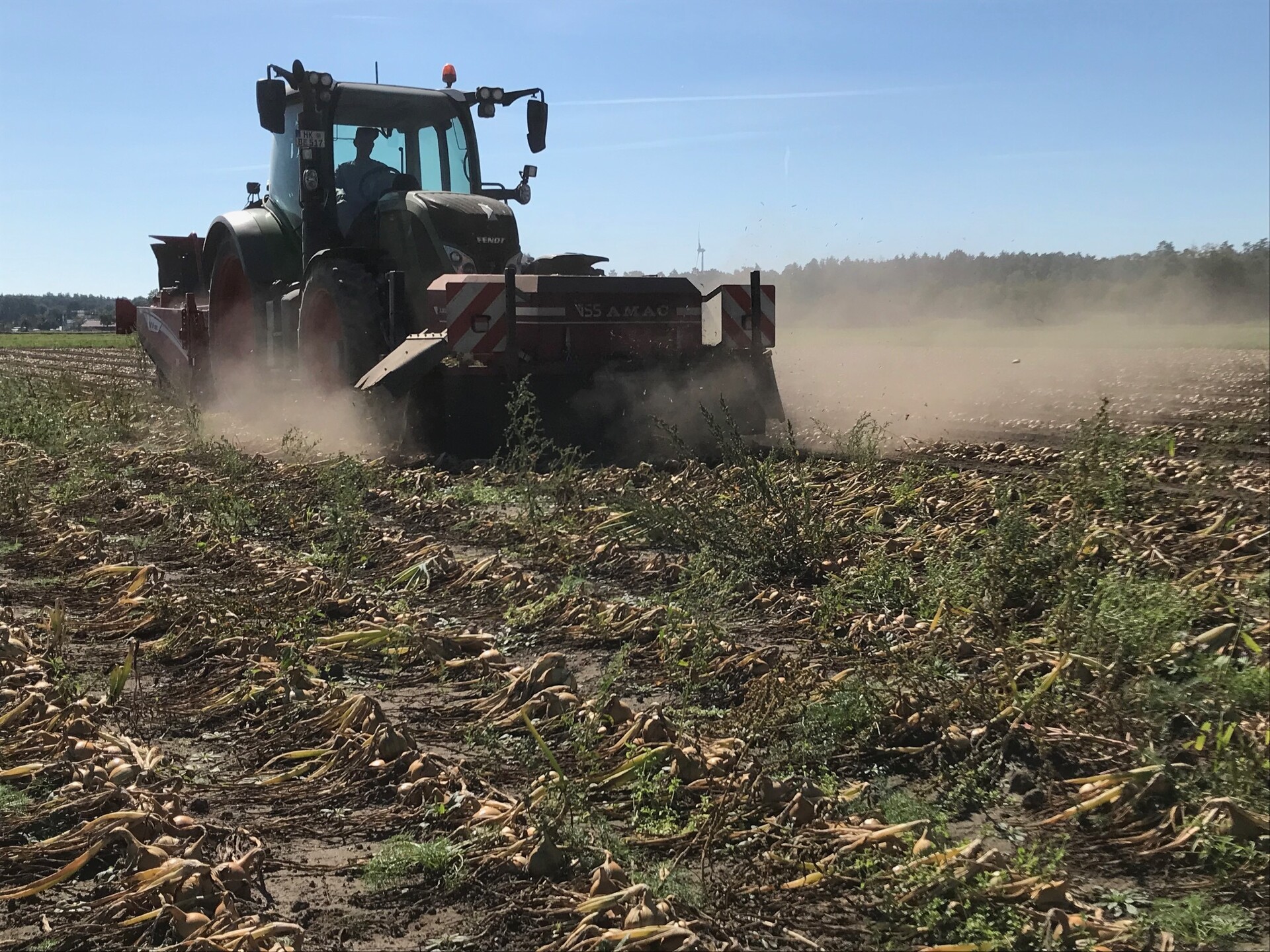 Im Ackerbau beschäftigen wir uns vor allem mit der Kulturpflege, der Ernte sowie der Erntegutsortierung. Zum Start der Ausbildung steht die Kartoffel- und Zwiebelernte an. Die Auszubildenden helfen beim Sortieren und Abfahren des Ernteguts. Im Anschluss folgt die Silomaisernte, die von unserem lokalen Lohnunternehmer praktiziert wird. Nach der Ernte steht die Herbstaussaat an. Des Weiteren haben wir eine Zwiebelhalle, in der wir auch im Lohn einlagern und aufbereiten. Im Winter widmen wir uns der Erntegutsortierung (Zwiebeln, Kartoffeln, Rote Bete). Im Frühjahr starten wir dann wieder draußen auf dem Acker. Die Frühjahrsaussaat, die spätere Kulturpflege und die Beregnung stehen im Fokus. Das Pflügen, Pflanzenschutzmaßnahmen und die Gülleausbringung werden dabei von einem Lohnunternehmer übernommen.