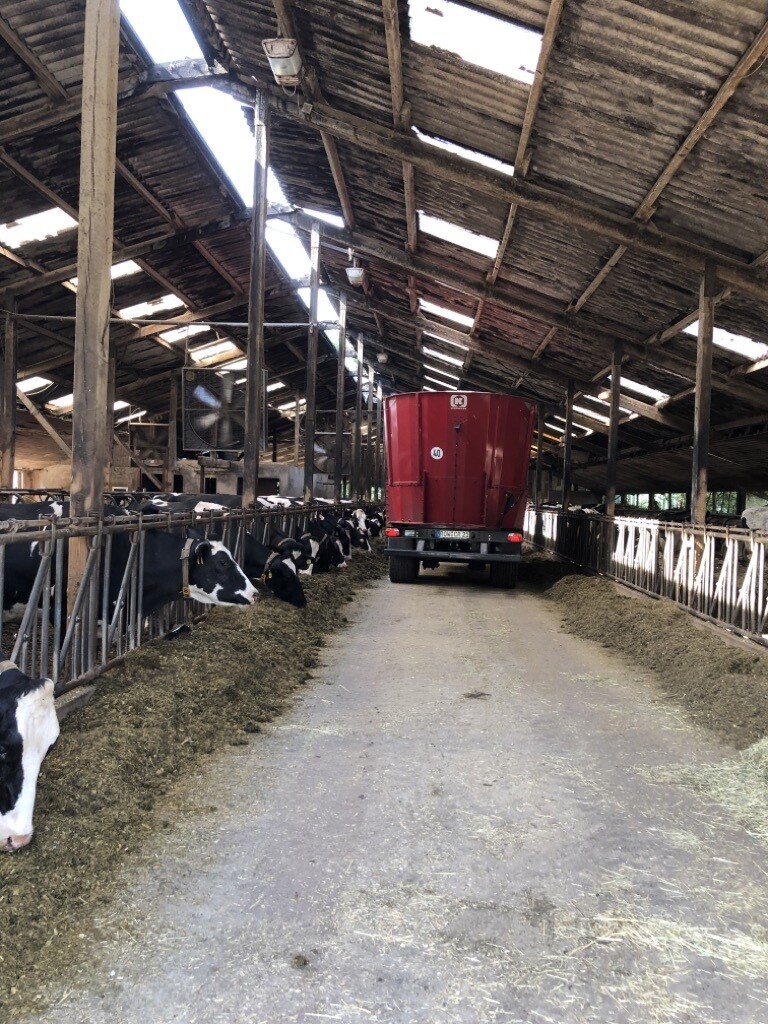 Gefüttert werden die Tiere mit einer Voll-TMR durch einen 22 m³ Futtermischwagen. Dieser wird mit einem Radlader beladen.