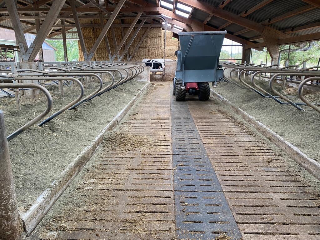 Die Tiere werden mit einem Futtermischwagen gefüttert. Je nach Tiergruppe werden individuelle Rationen vorgelegt.