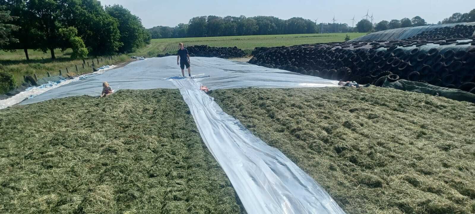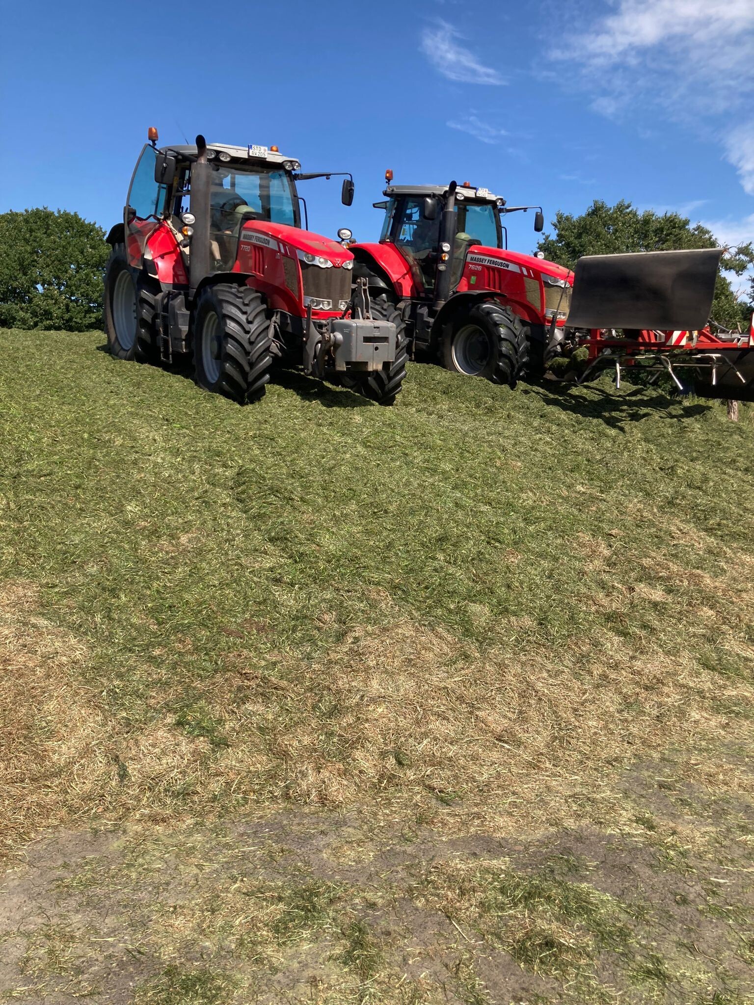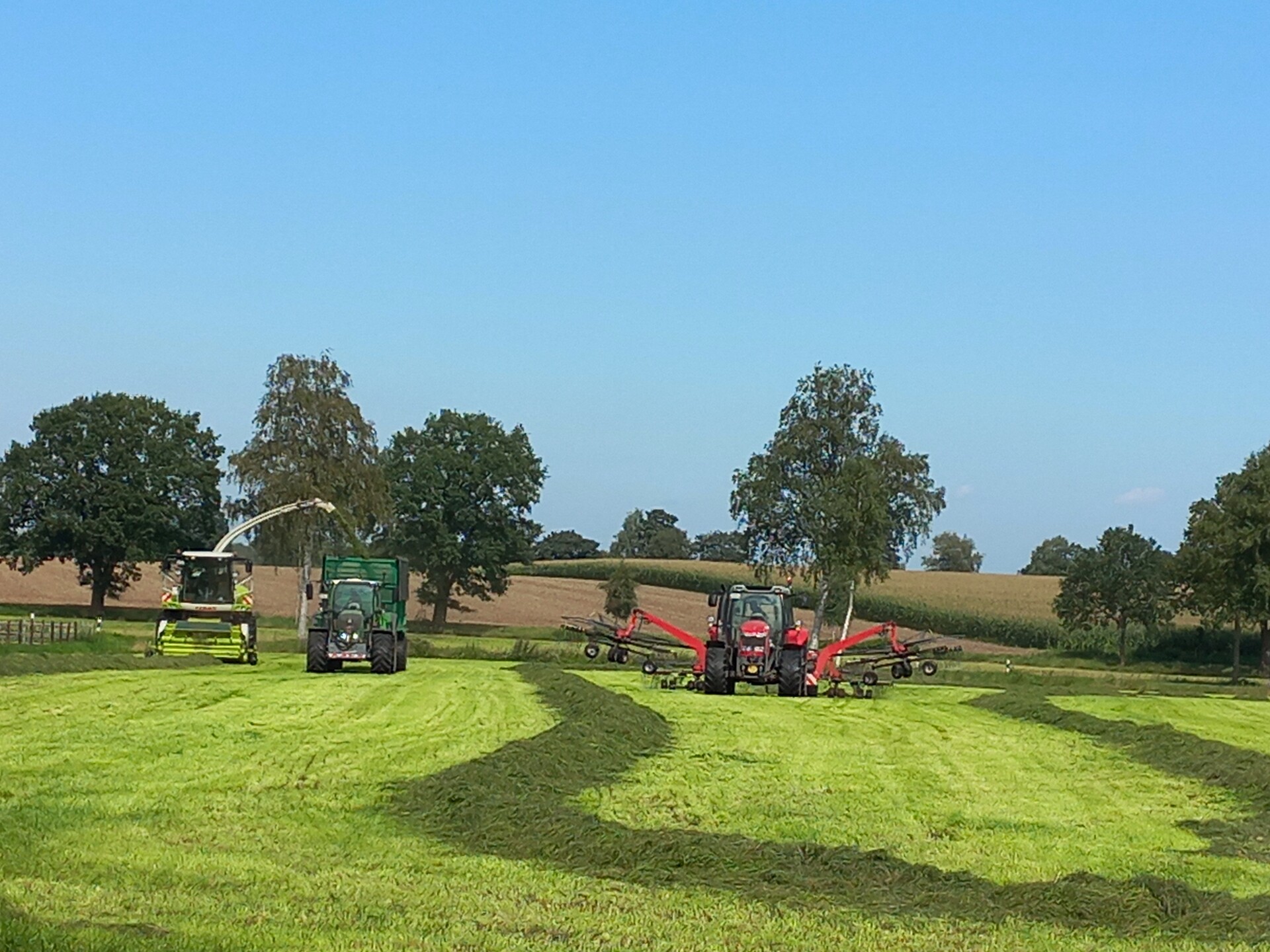 - Grasernte: Schmetterling sowie ein Front- und ein Heckmähwerk. Mit einem 11,70m Heuwender von Claas wird gekehrt. Als Schwader dient ein 4-Kreiselschwader 12,50m. Wir führen das Mähen, wenden und schwaden sowie Silo festfahren und abdecken selbst durch ;-).