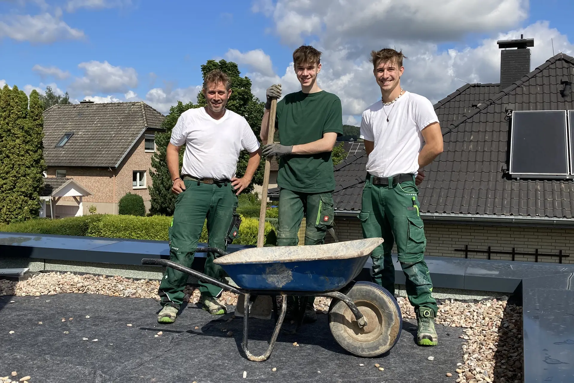 Der 22-jährige Luke (1. Bild, von rechts) und sein Bruder Phil (16 Jahre) befinden sich mit ihrem Vater Hubertus auf einer Baustelle in Bad Pyrmont. Luke hat vor Kurzem seine Ausbildung zum Gärtner im Garten- und Landschaftsbau abgeschlossen, Phil hat gerade angefangen. Beide Söhne sind im Galabaubetrieb des Vaters tätig, der selbst mit auf der Baustelle anpackt.