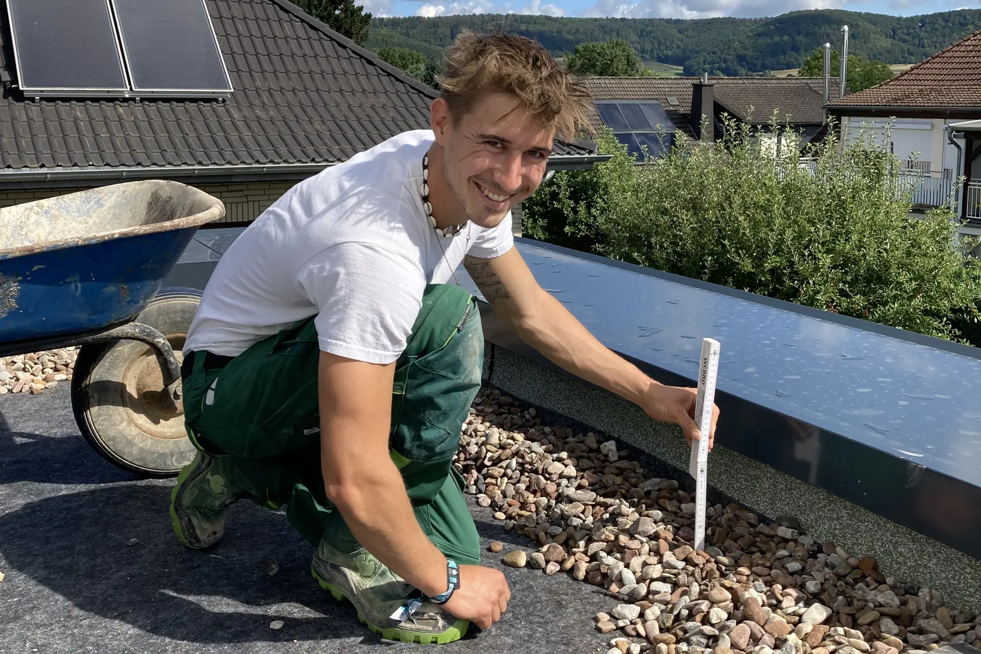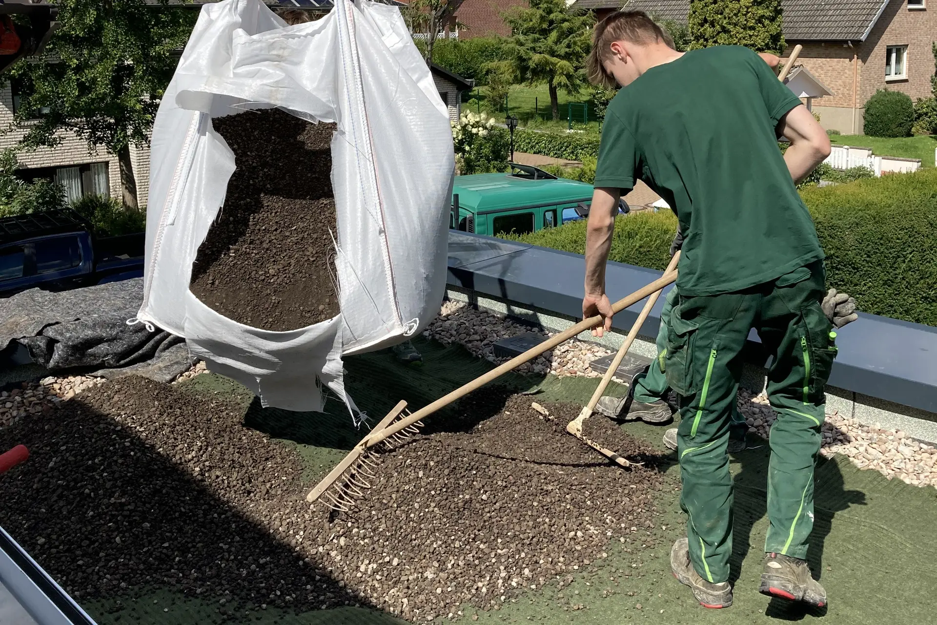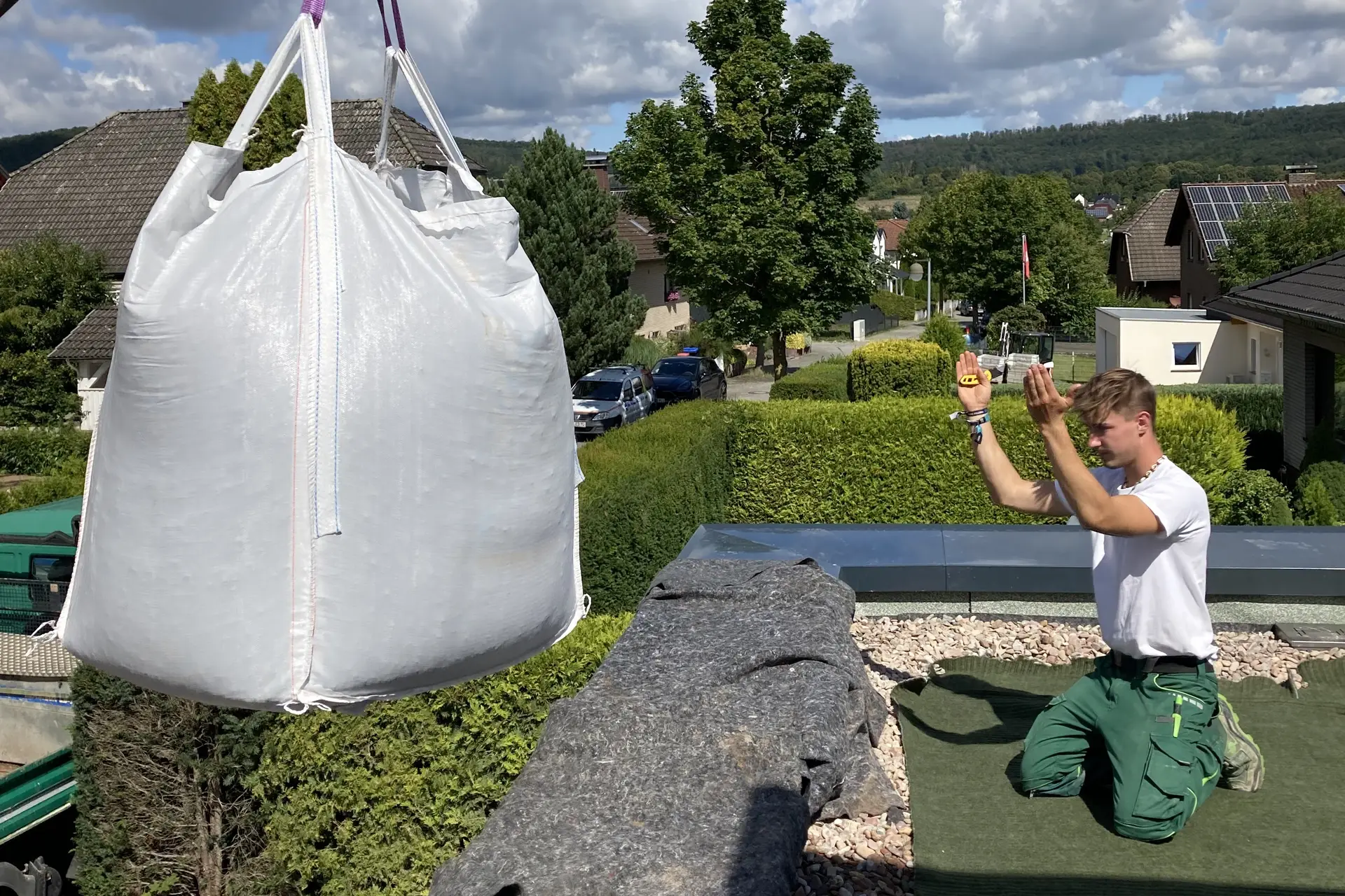 Heute steht die Dachbegrünung auf dem Plan. Dafür legen die Jungs die Folie aus und befestigen sie mit Kies. Mit dem Teleskoplader wird das Vlies mit Wasserspeicher- und Dränfunktion aufs Dach gebracht. Nachdem das Vlies ausgerollt ist, kann das Substrat aufgeschüttet werden – später wird die Fläche dann bepflanzt. In diesem Fall handelt es sich um eine sogenannte „Extensivbegrünung“: Das bedeutet, dass die Fläche weniger genutzt wird und somit - im Gegensatz zur „Intensivbegrünung“ - auch weniger Pflege notwendig ist.