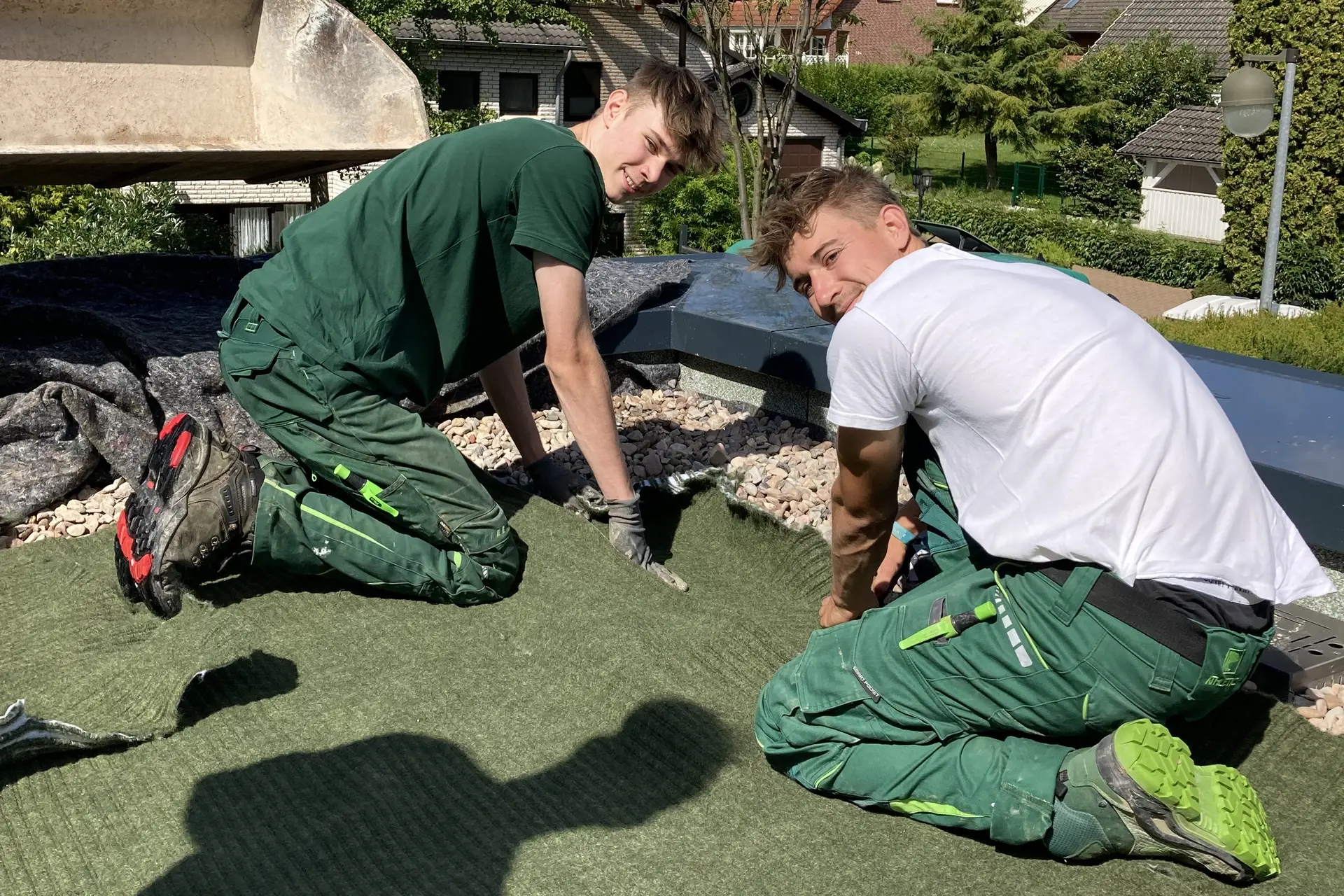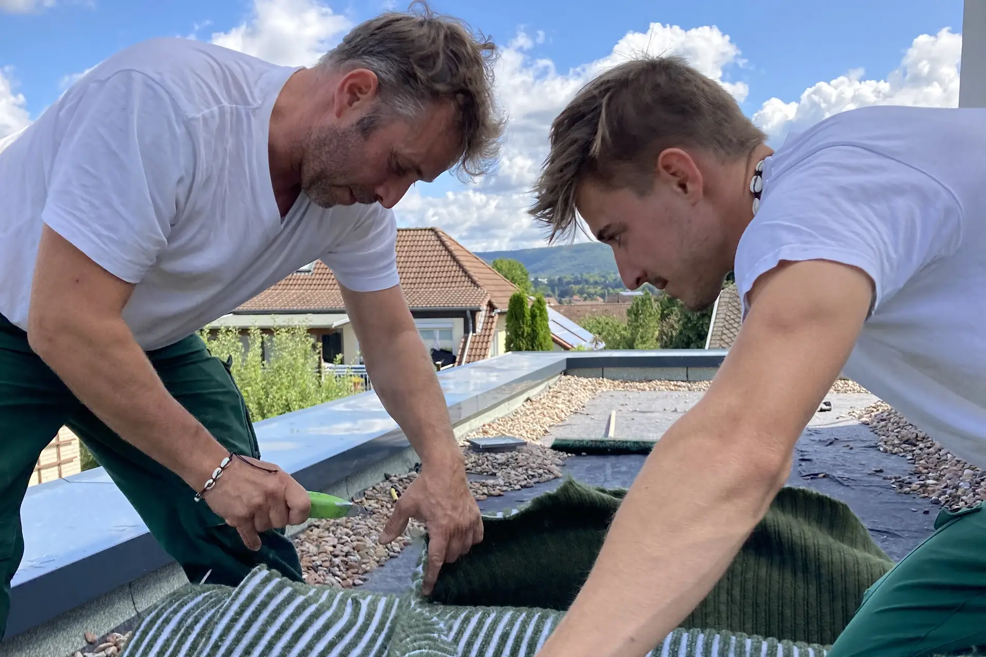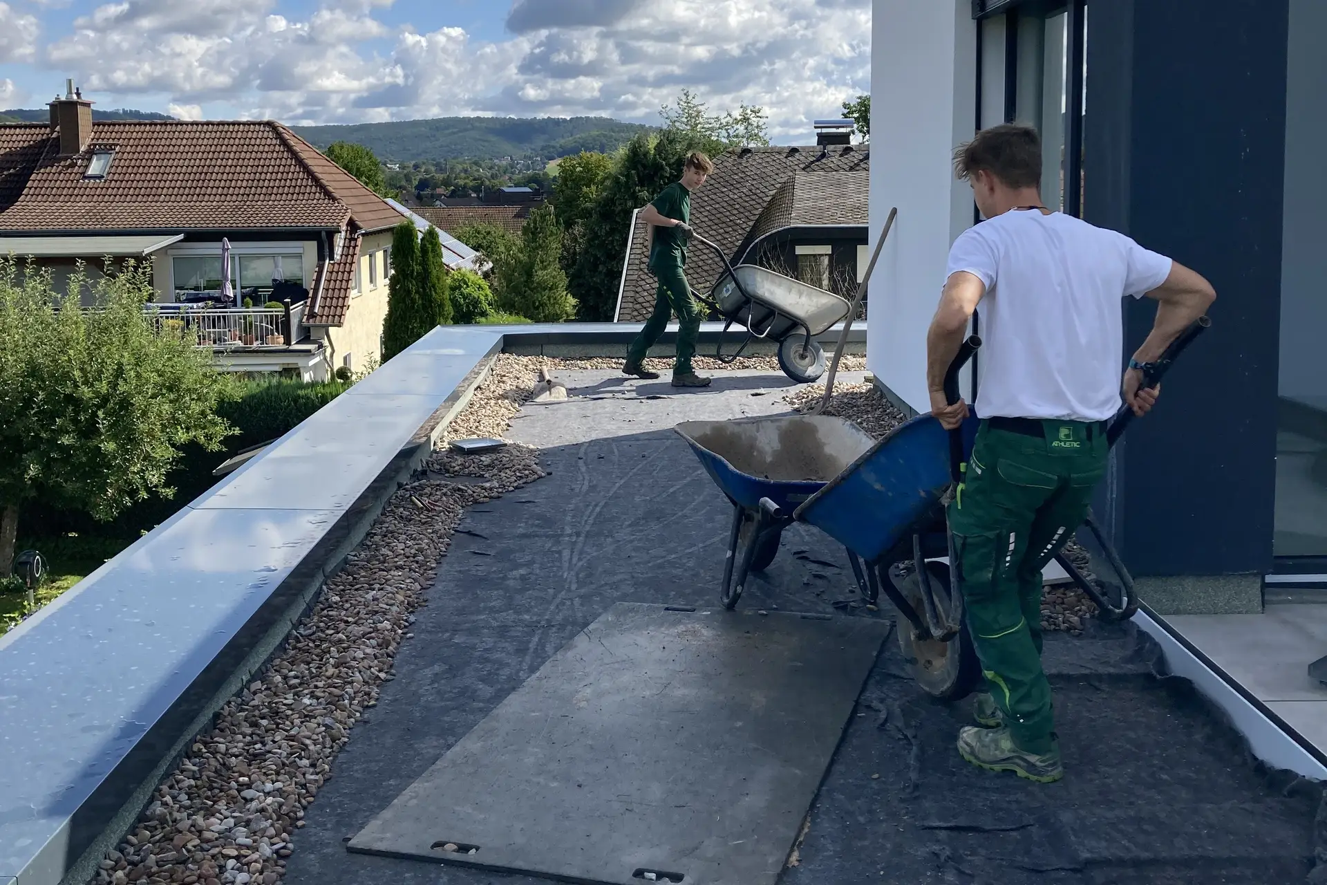 Heute steht die Dachbegrünung auf dem Plan. Dafür legen die Jungs die Folie aus und befestigen sie mit Kies. Mit dem Teleskoplader wird das Vlies mit Wasserspeicher- und Dränfunktion aufs Dach gebracht. Nachdem das Vlies ausgerollt ist, kann das Substrat aufgeschüttet werden – später wird die Fläche dann bepflanzt. In diesem Fall handelt es sich um eine sogenannte „Extensivbegrünung“: Das bedeutet, dass die Fläche weniger genutzt wird und somit - im Gegensatz zur „Intensivbegrünung“ - auch weniger Pflege notwendig ist.